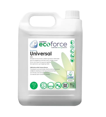 Ecoforce Universal er et effektivt og miljøvennlig rengjøringsmiddel for daglig rengjøring av gulv og harde overflater. Produktet er konsentrert og allsidig, og gir grundig resultat ved bruk med både mopp, klut, spray eller gulvvaskemaskin. Ecoforce Universal er EU Ecolabel-godkjent og utviklet med tanke på bærekraft og kvalitet.